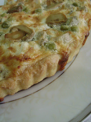 5.Sıvı karışıma kaşar peynir, tavuk, bezelye ve mantarı katarak karıştıralım ve bu karışımı soğuyan kiş hamurumuzun üstüne yayıp, 200 derecede sıcak fırında üstü kızarıncaya kadar pişirelim.